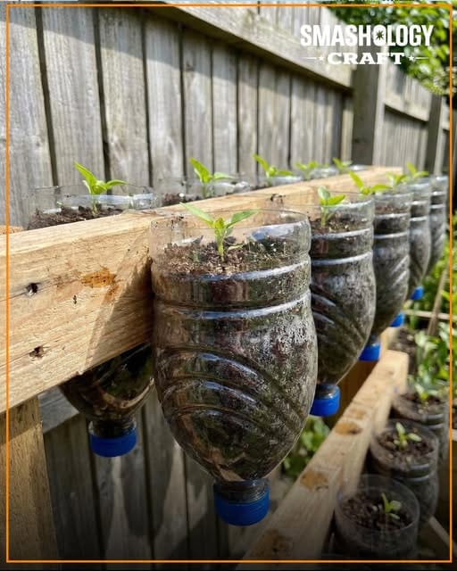 Take a plastic bottle and cut it into two sections, leaving a strip uncut to act as a hinge or strap. Then hang it over a rod or tree branch and plant in both halves.