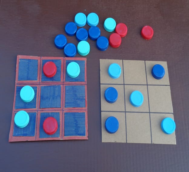For playing pieces, collect water bottle caps, big buttons, bread tags, five for each player. Paint or colour one set in one shade and the other in another. Nail polish, craft paint, or even stickers will do the trick.