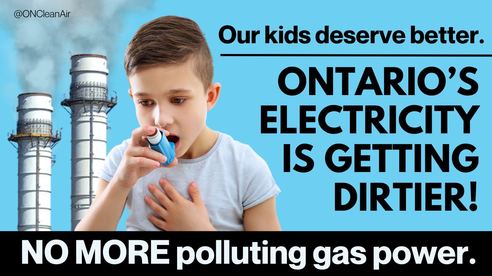 25% of Ontario’s electricity supply in 2030 will be produced by burning fossil gas – up from only 4% in 2017. Ramping up gas power is bad for our climate and bad for our health. The pollutants released by these gas plants contribute to lung and heart diseases, Alzheimer’s and other neurological risks, asthma, cancers, birth complications and premature death. Wind and solar are now our cleanest and lowest cost sources of new electricity supply. Off-shore wind power in the Great Lakes alone could meet all our electricity needs. Also, solar panels on Toronto’s large parking lots could produce 2.5 x more power than the Portlands gas plant on Toronto’s waterfront produced in 2023. 85% of electricity supply added worldwide in 2023 came from renewables. Ontario needs to embrace the target set at the COP 28 climate summit and triple our wind and solar electricity capacity and double our energy efficiency which will •Lower electricity bills • Phase-out polluting gas power • Create good jobs• Provide clean power for Ontario’s manufacturing & mining industries • Protect our health • Help us meet our climate commitments • Reduce the need for more costly nuclear reactors.