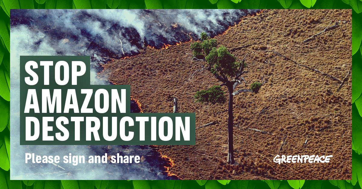 Our world’s largest rainforest is under attack. Industrial-scale agriculture is cutting and burning huge areas of the Amazon. This home to endangered species and Indigenous communities is one of our greatest hopes for a livable future. People are demanding that global leaders respect the Amazon, act on their promises to halt deforestation, regulate and stop funding its destroyers, and fund Indigenous and local solutions to protect and restore it. Join the movement to help stop Amazon forest destruction by adding your name to support this living, global treasure.