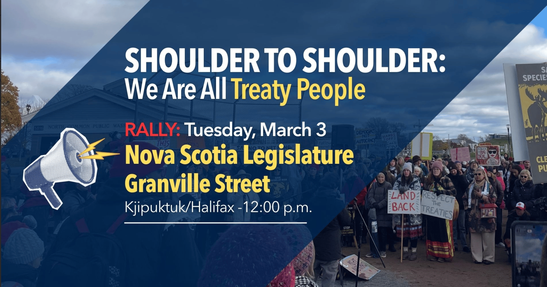 The purpose of this rally is to stand Shoulder-To-Shoulder in solidarity with land defenders and water protectors at Tqamuoweye'katick/Hunter's Mountain and ALL other resistance movements in Nova Scotia/Mi'kma'ki. This time, we are taking it to Tim Houston's Office - the Legislature building, during the spring sitting. Together, let's tell Tim Houston to STOP selling our futures, and demand that he respect the Treaties, our democratic rights, and our community voices!
