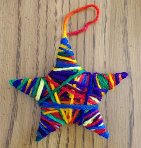 The craft itself is simple enough for even the youngest child. Cut star shapes from a cardboard box (There are free printable templates online). Tape a piece of yarn at the back to make a hanger, then wind yarn around the star until the cardboard is covered and tie it off.