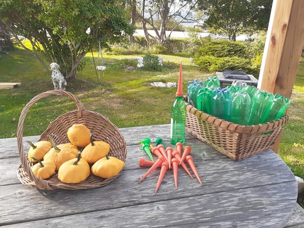 Oh, Pics for you from the fog fence garden and a true sign of fall, pumpkins sitting beside the recently cleaned drip irrigation bottles, all ready for next year.