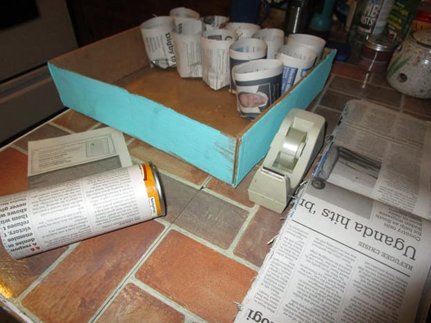 Start by separating the double newspaper sheets into single sheets, then cut each sheet in half. For each pot you’ll need two strips of paper and a 10-ounce soup can.